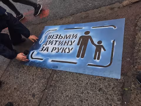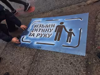 На тротуарах перед пішохідними переходами патрульні, спільно з учнями школи, за допомогою трафаретів, нанесли попереджувальні надписи “Візьми дитину за руку”, «Зніми навушники», “Сховай телефон”, “Подивися праворуч”, щоб акцентувати увагу пішоходів на рух транспорту та закликати їх бути уважними на дорозі.