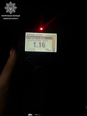 У 20-річного водія поліцейські виявили ознаки алкогольного спʼяніння. Перевірка на пристрої Драгер показала результат 1,16 проміле.