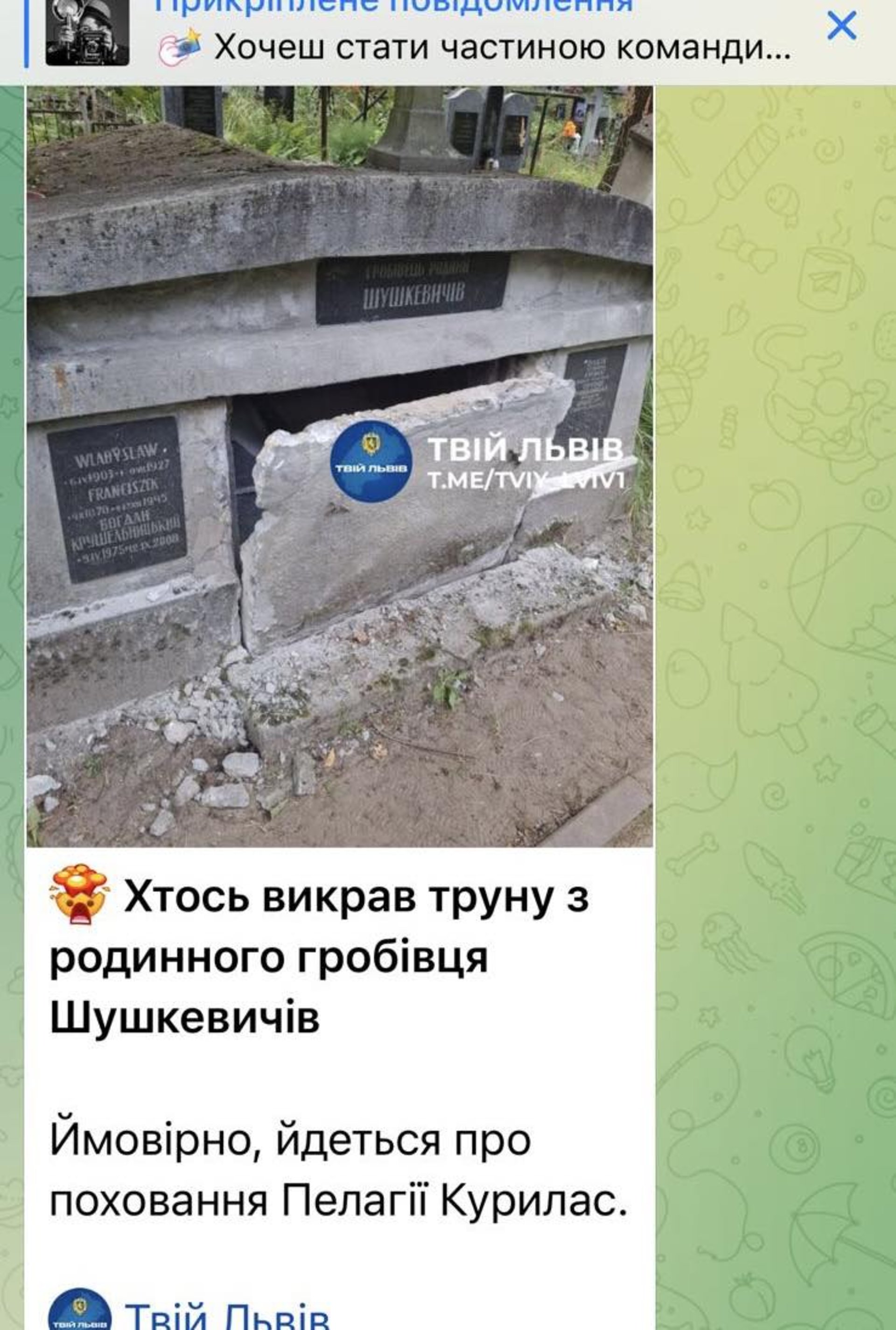 Сьогодні, 17 серпня у телеграм-каналі ''Твій Львів'' було розміщено повідомлення про, нібито, факт викрадення труни з сімейної могили т.зв. ''гробівця'' родини Шушкевич. Про це повідомив депутат ЛМР Ігор Зінкевич.