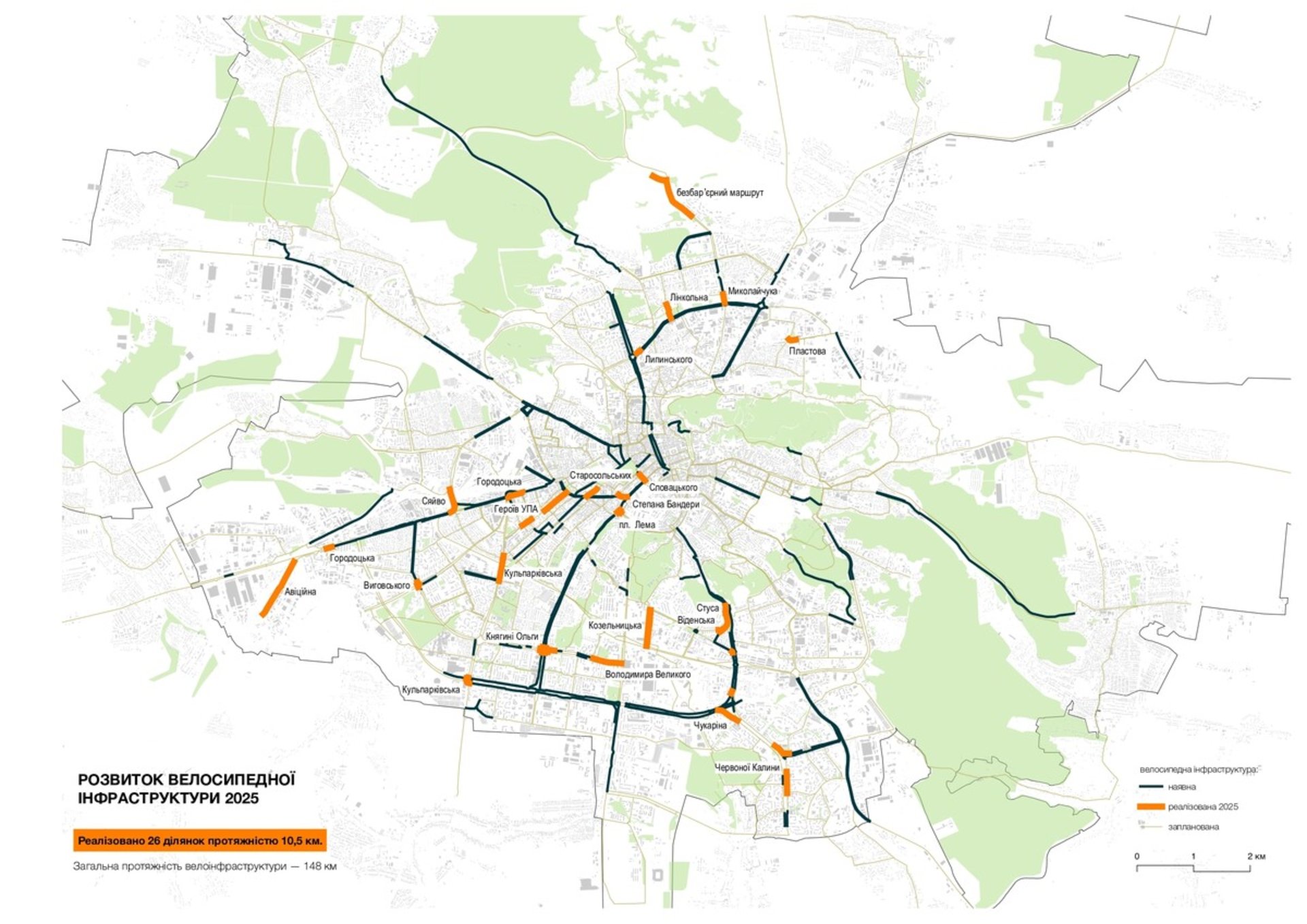 За словами заступника директора департаменту міської мобільності та вуличної інфраструктури ЛМР з розвитку велоінфраструктури Ореста Олеськіва, ключовим завданням року було «зшивання» раніше збудованих фрагментів у єдину систему. Зокрема, важливі сполучні ланки з’явилися на великих транспортних розв’язках: площі Лема (перехрестя Коперника — Сахарова — Вітовського), перехресті Любінської та Виговського, а також на кільцевих розв'язках Володимира Великого — Княгині Ольги та Наукова — Кульпарківська.