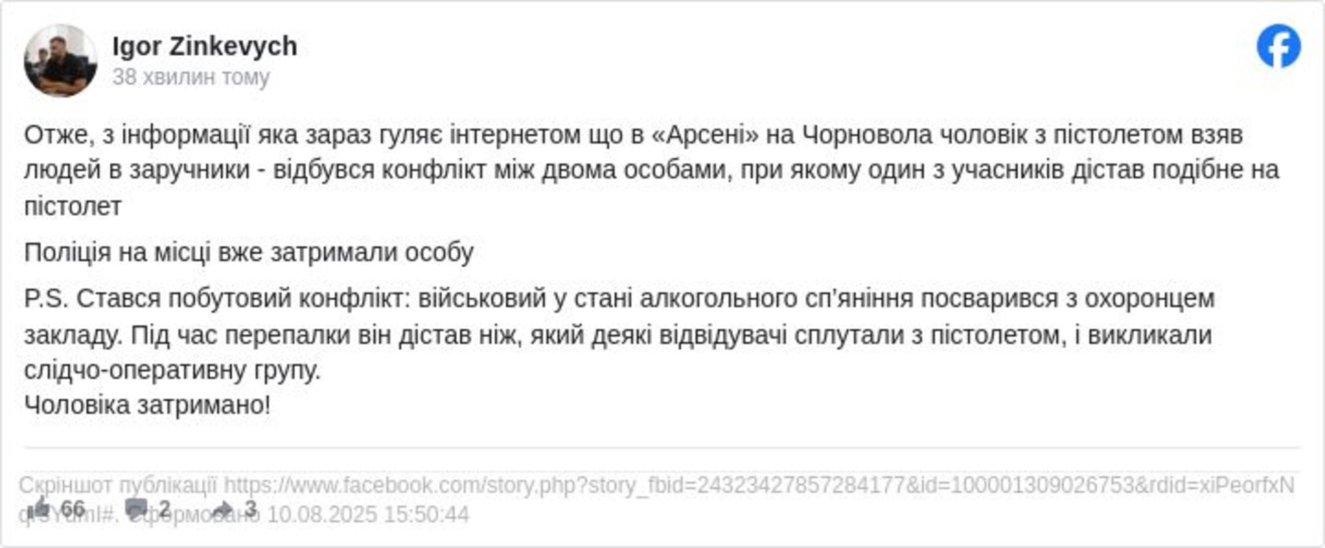 Сьогодні, 10 серпня, близько 18 години у Львові в «Арсені» на Чорновола відбувся конфлікт. Про це повідомив депутат ЛМР Ігор Зінкевич.