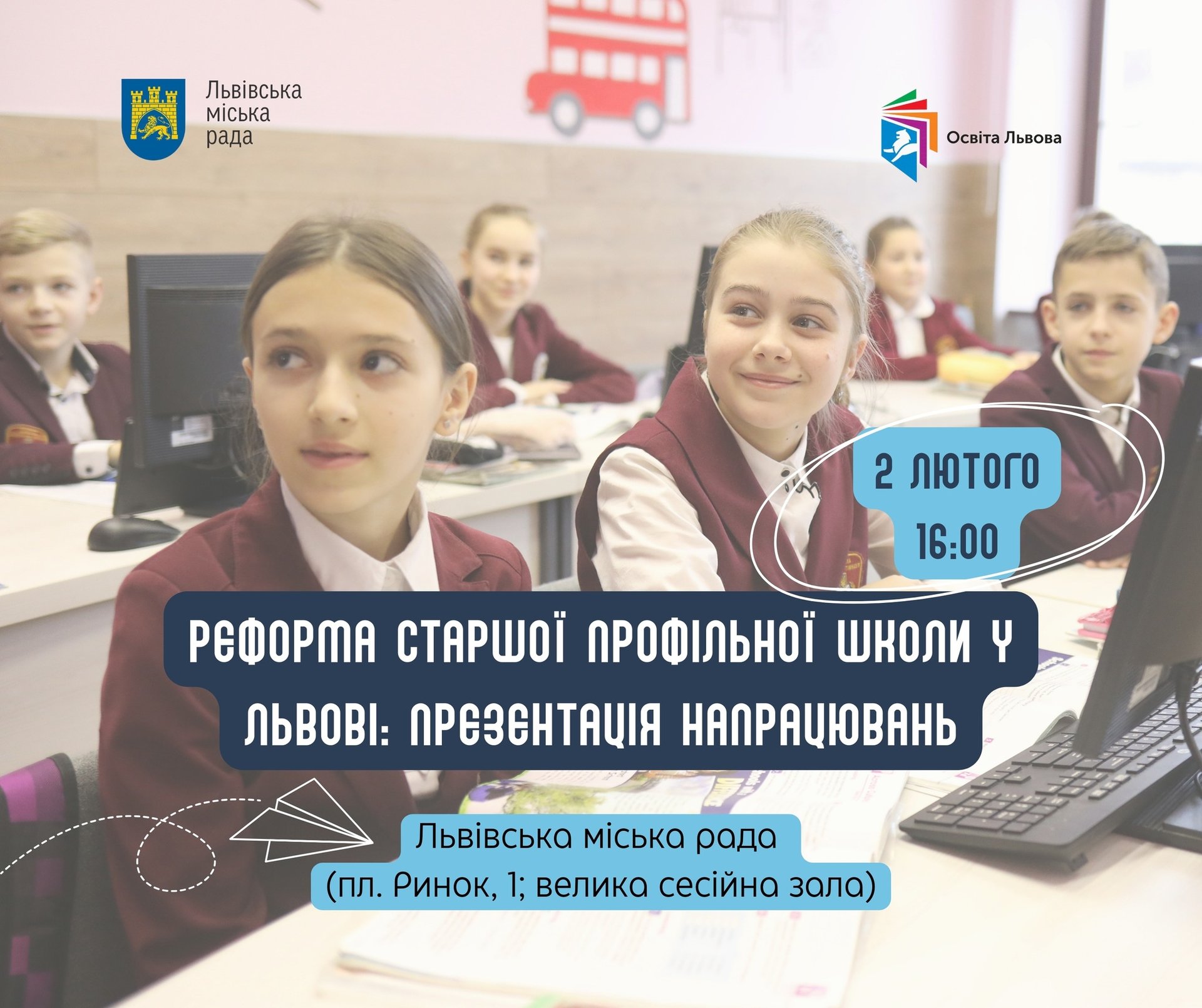 Освіта Львова запрошує освітян, батьків, депутатів, журналістів та всіх зацікавлених мешканців на публічну презентацію реформи старшої профільної школи.