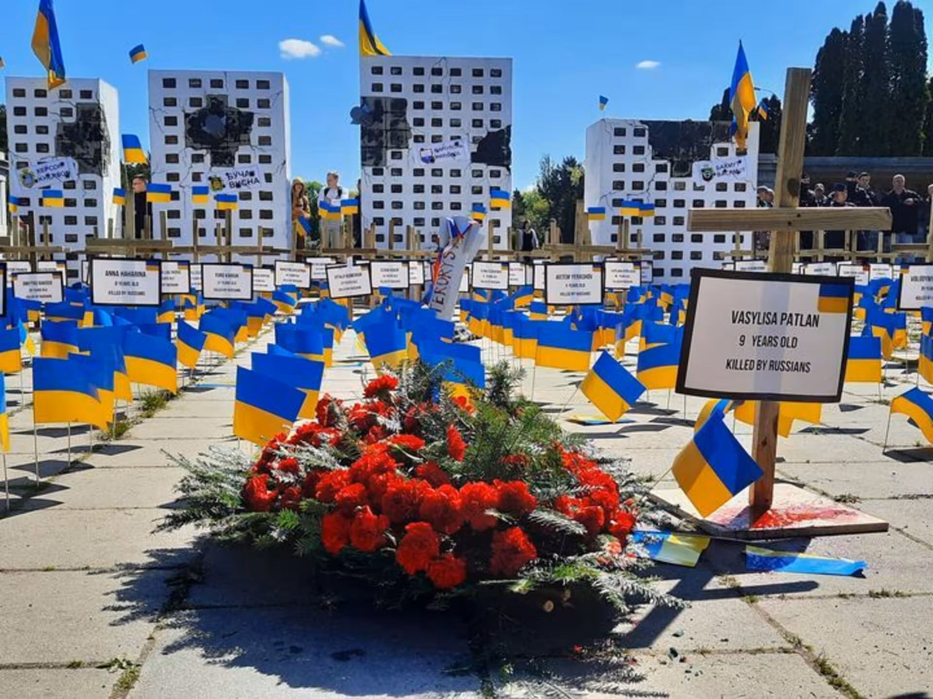 У Варшаві біля пам’ятника радянським солдатам активісти встановили інсталяцію у вигляді знищених росіянами українських міст: Маріуполя, Бучі, Ірпеня, Херсона; через це посол РФ у Польщі не зміг покласти квіти до монумента.