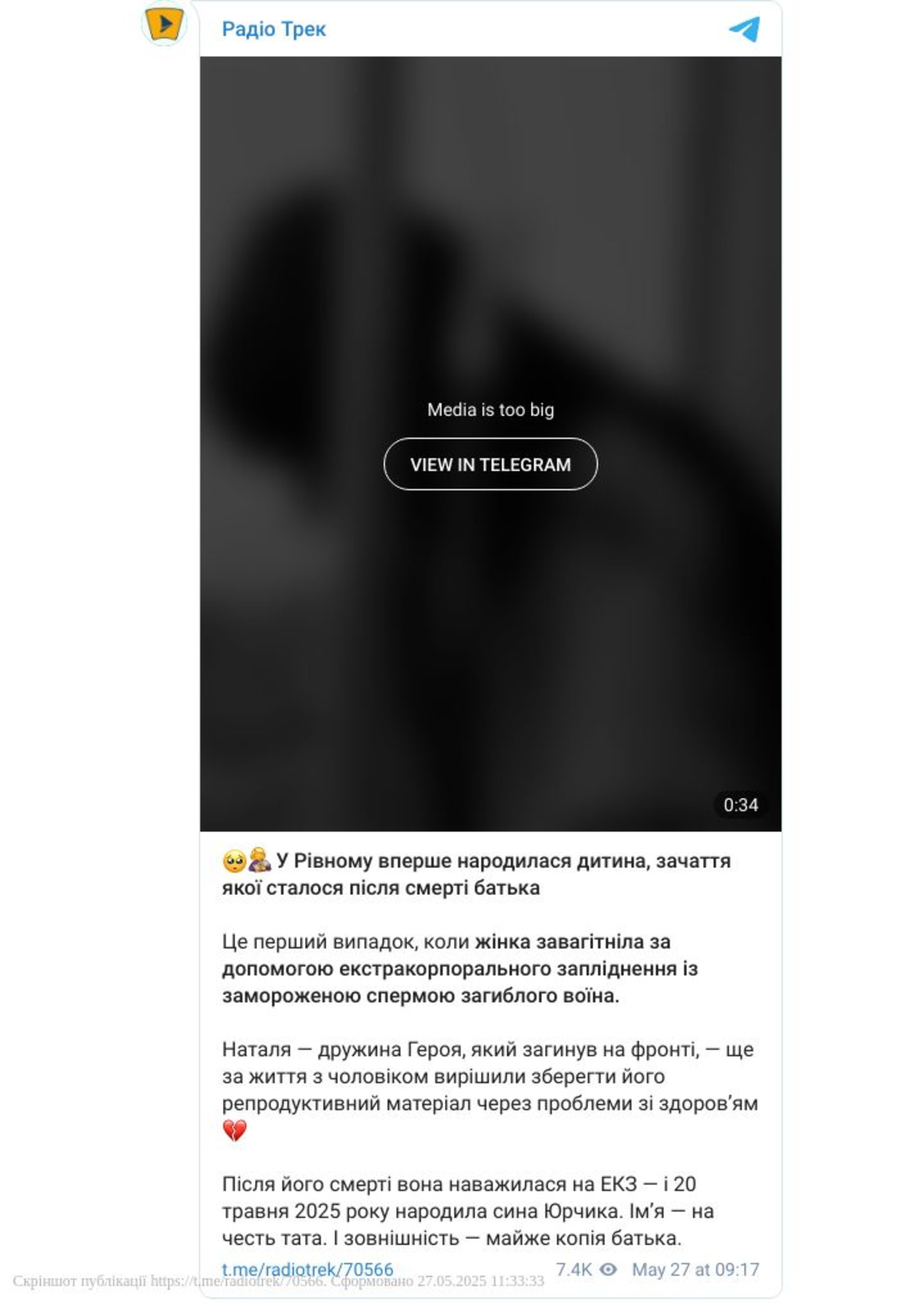 «Це і перший випадок запліднення після смерті чоловіка (екстракорпоральним заплідненням (ЕКЗ) із замороженою спермою) у центрі репродукції "Благодар". Це не сюжет фільму. Це реальна історія кохання, сили й віри. Наталя — дружина Героя, який загинув на фронті, захищаючи Україну, розповіла шлях, який вони розпочинали разом із чоловіком.