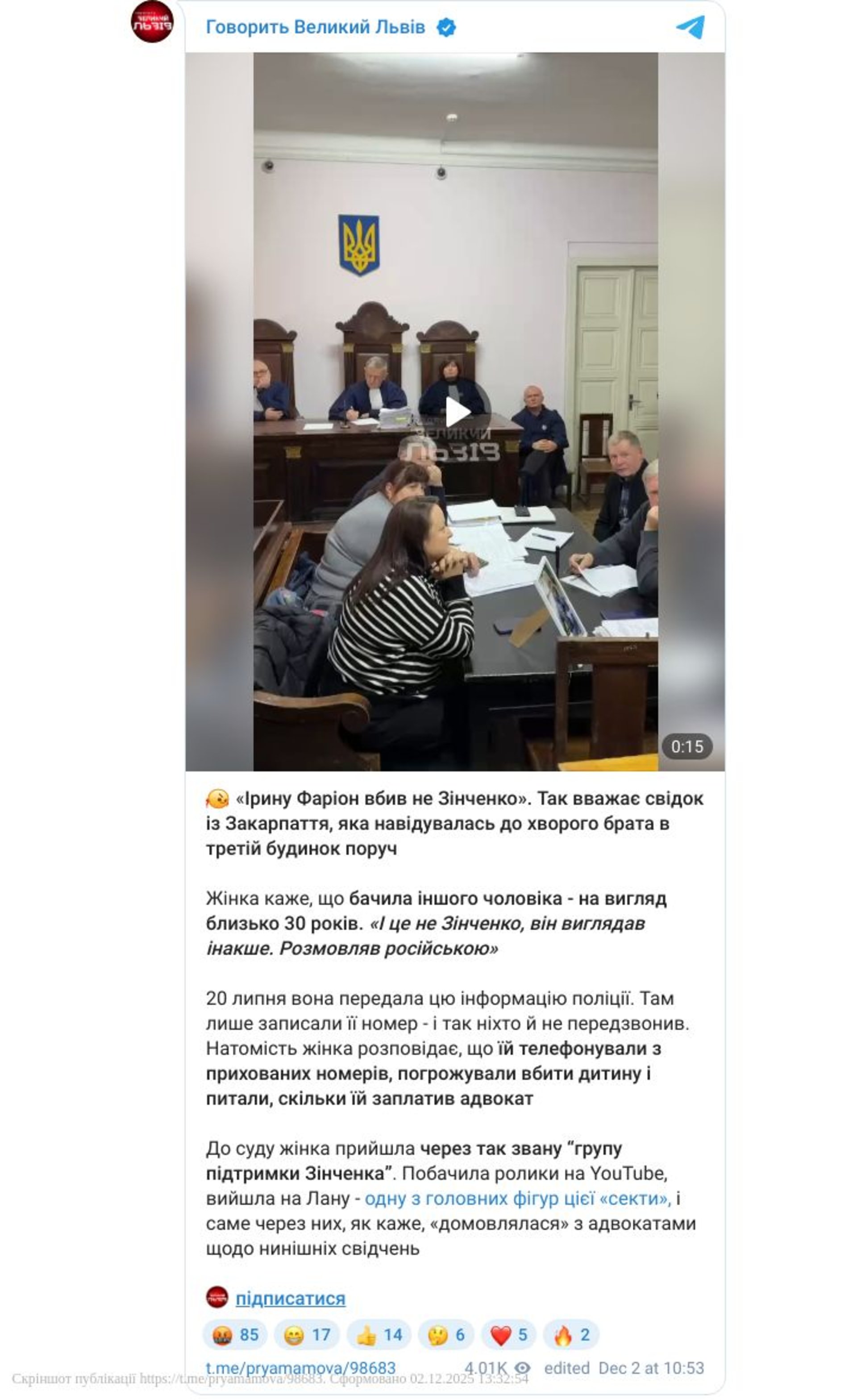 У суд жінка потрапила через так звану "групу підтримки Зінченка" та вважає, що юнак не винен у вбивстві Фаріон.