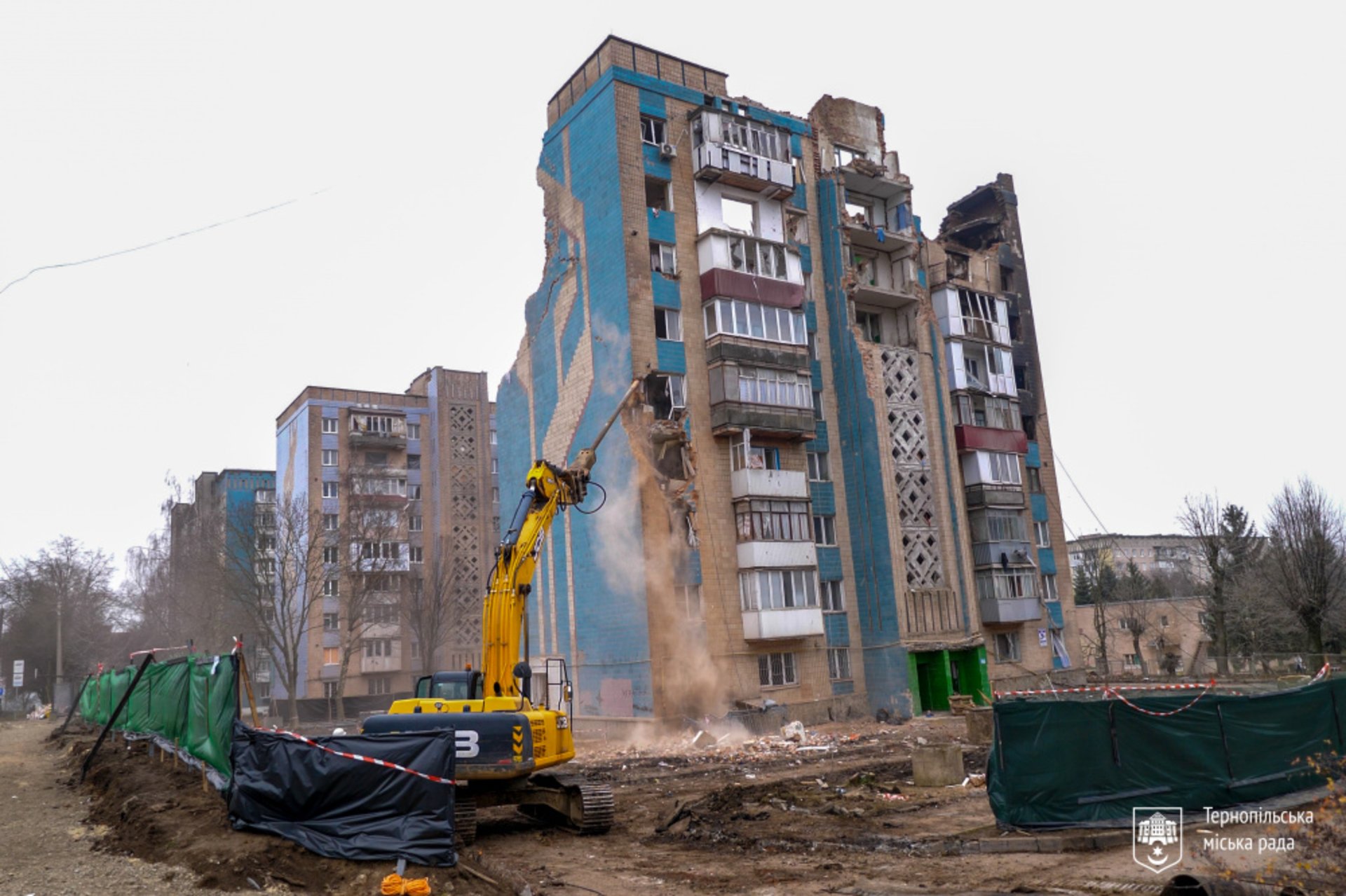 У Тернополі розпочали демонтаж багатоквартирного будинку на вул. Василя Стуса, у який 19 листопада влучила російська ракета. Навколо будівлі встановлено огорожу, розбір конструкцій здійснюють фахівці зі спецтехнікою.