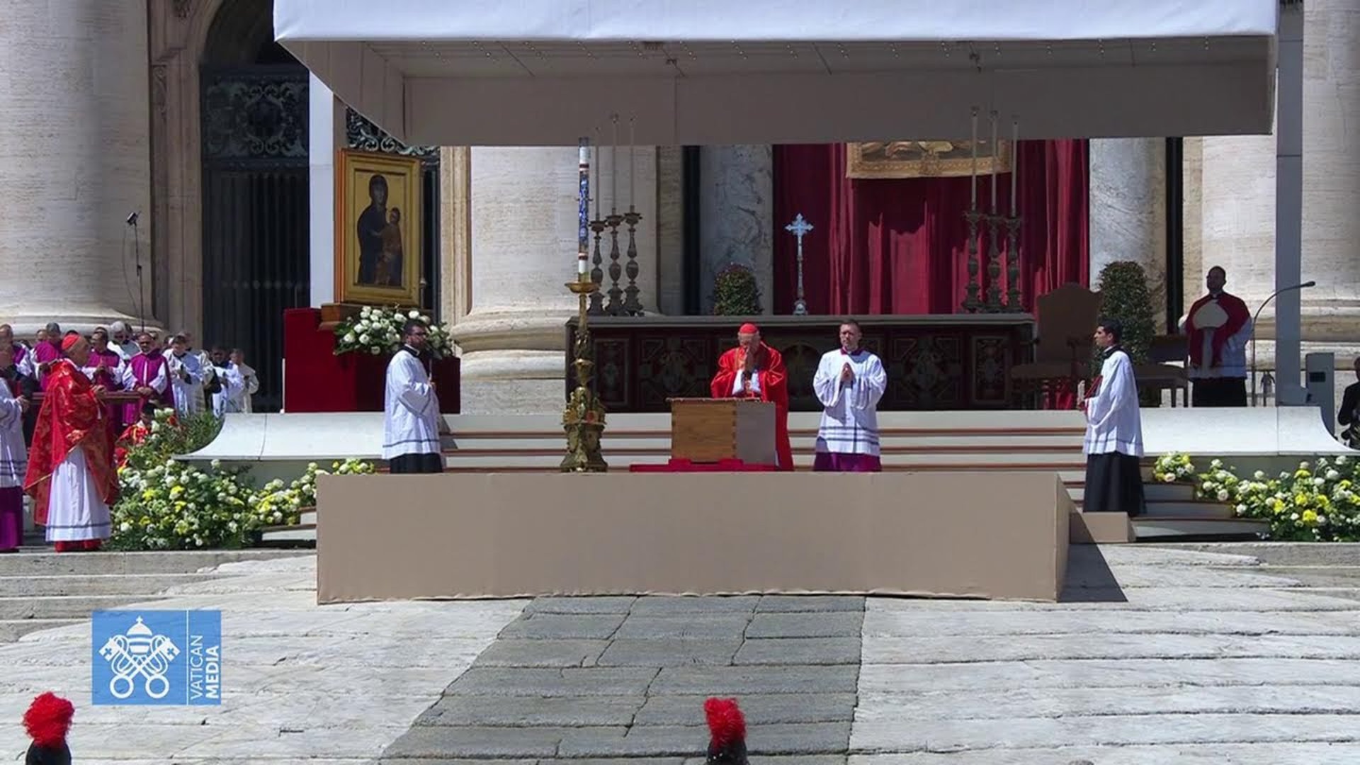 Під час бурхливих оплесків присутніх кардинал Ре сказав, що тепер, коли Папа Франциск спочиває в Божих обіймах.