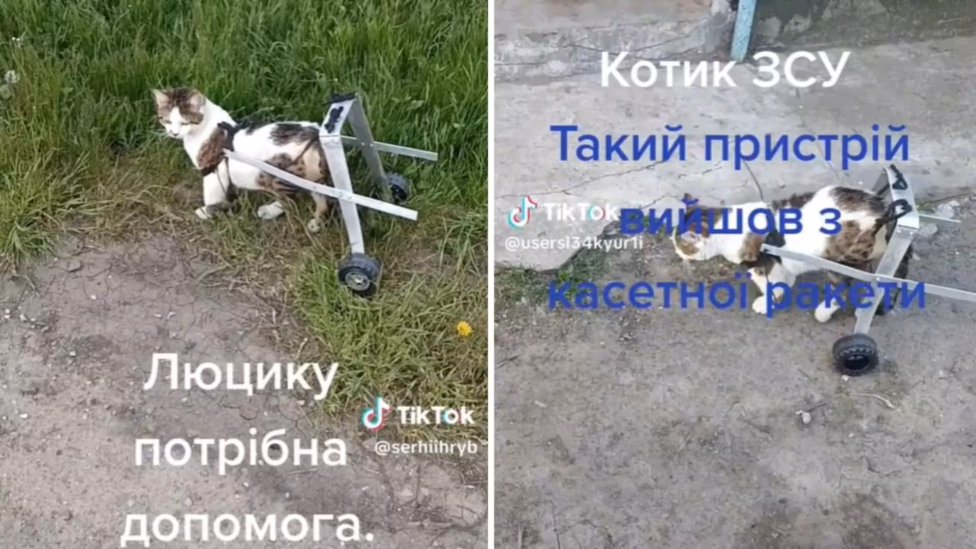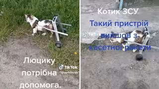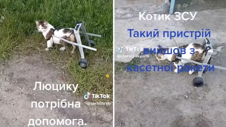 Як повідомив у себе в TikTok військовий Сергій Гриб, вони зробили кошеняті візочок із касетного снаряда рф. Він виконує фукцію його задніх лап, оскільки його власні — відмовили: «У нашого котика »Люцика« відмовили задні лапи. Це друга версія касетної ракети рф», — пише воїн. За його словами, вони не знають, що з ним сталося. Підозрюють, що тваринка десь впала та забилася, оскільки спершу кіт бігав нормально. Одного ранку його знайшли таким.