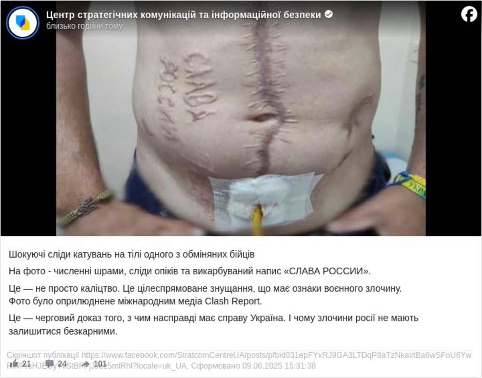 "Шокуючі сліди катувань на тілі одного з обміняних бійців. На фото — численні шрами, сліди опіків та викарбуваний напис «Слава Росії». Це — не просто каліцтво. Це цілеспрямоване знущання, що має ознаки воєнного злочину", — йдеться в дописі в Facebook.