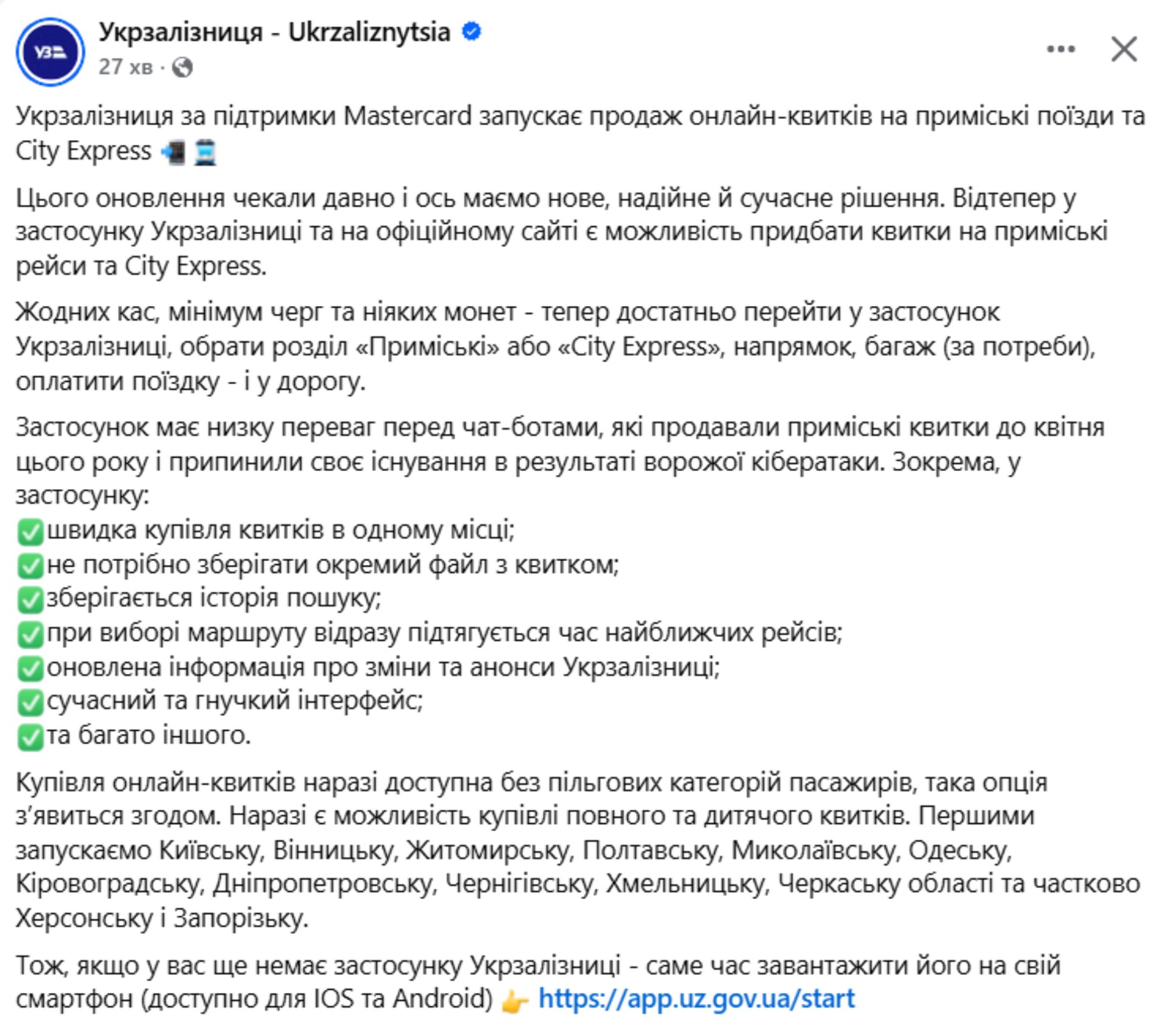 «Купівля онлайн-квитків наразі доступна без пільгових категорій пасажирів, така опція з’явиться згодом. Наразі є можливість купівлі повного та дитячого квитків. Першими запускаємо Київську, Вінницьку, Житомирську, Полтавську, Миколаївську, Одеську, Кіровоградську, Дніпропетровську, Чернігівську, Хмельницьку, Черкаську області та частково Херсонську і Запорізьку», зазначається у повідомленні компанії.