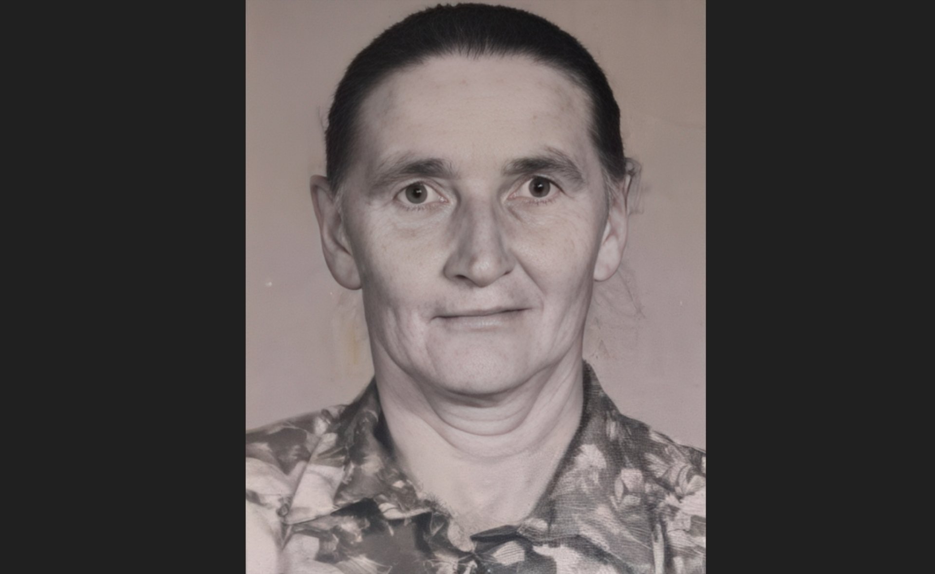 Була одягнена: У темно-зелену куртку, шерстяну синю хустку, сіру спідницю, чорні капці зі штучним хутром.