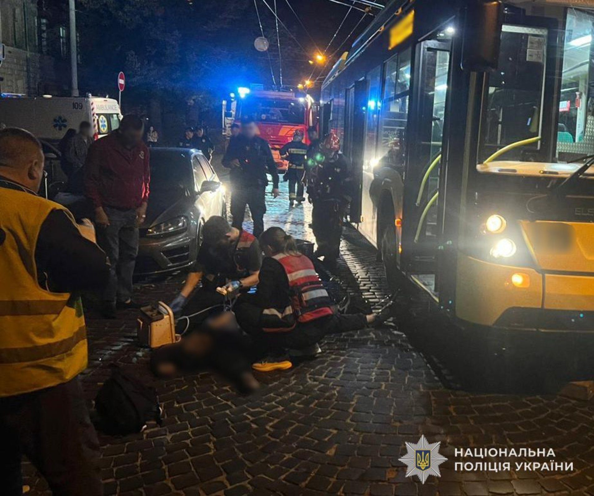 Рятувальники проводили роботи по деблокуванню чоловіка з-під тролейбуса за допомогою пневмоподушки та домкратів