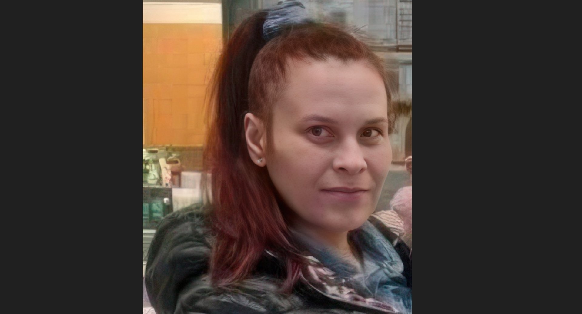 Опис - зріст 160см, худої тілобудови, довге червоне волосся. Одягнута у червону куртку із шкірзамінника(як на фото), чорні штани.