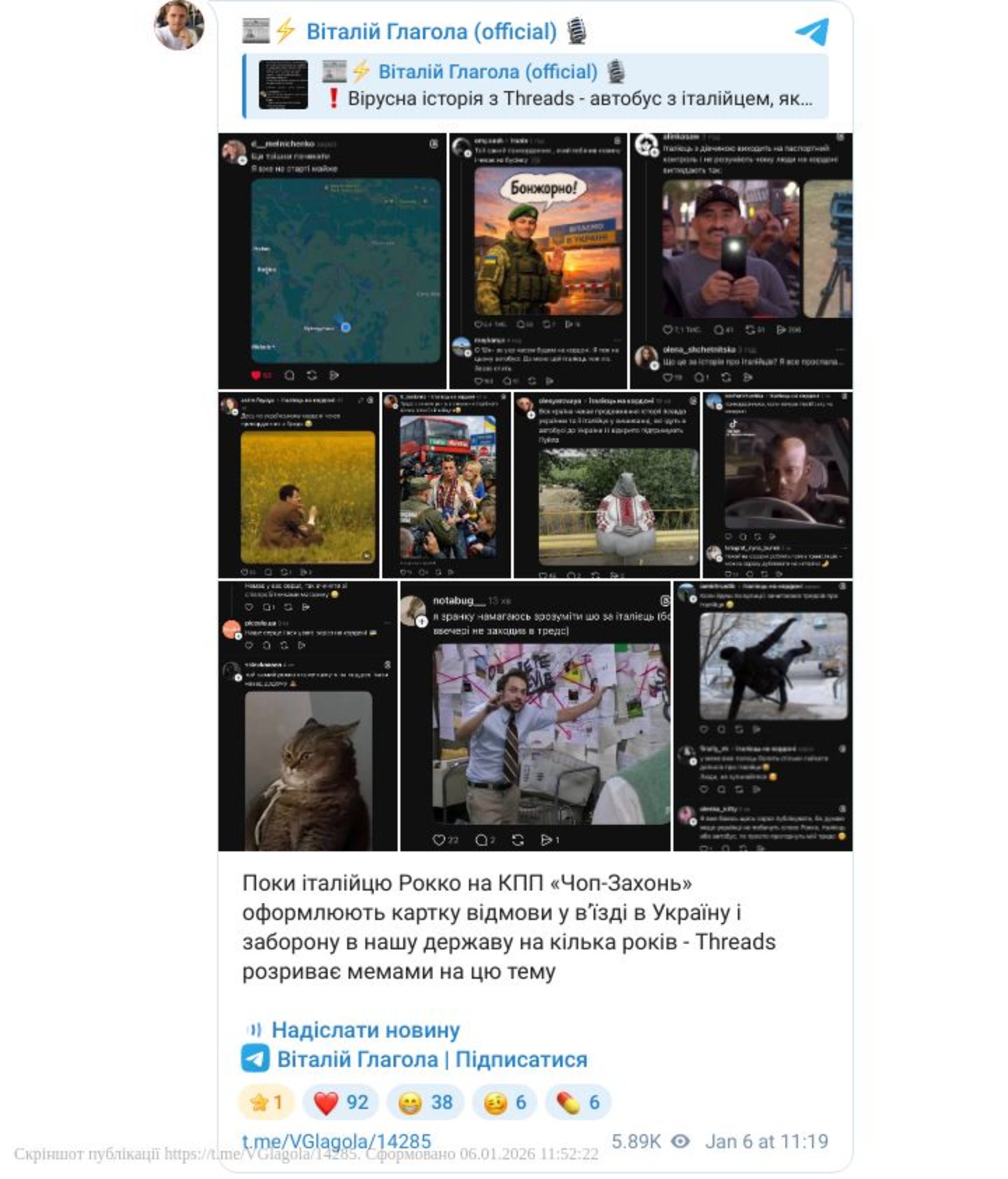 Журналіст Віталій Глагола заявив, що за його інформацією станом на 12:56 автобус з італійцем уже перебував на КПП "Чоп — Загонь". Речник Державної прикордонної служби України Андрій Демченко в коментарі Глаголі сказав, що прикордонникам відомо про ситуацію, яка набула розголосу в Threads.