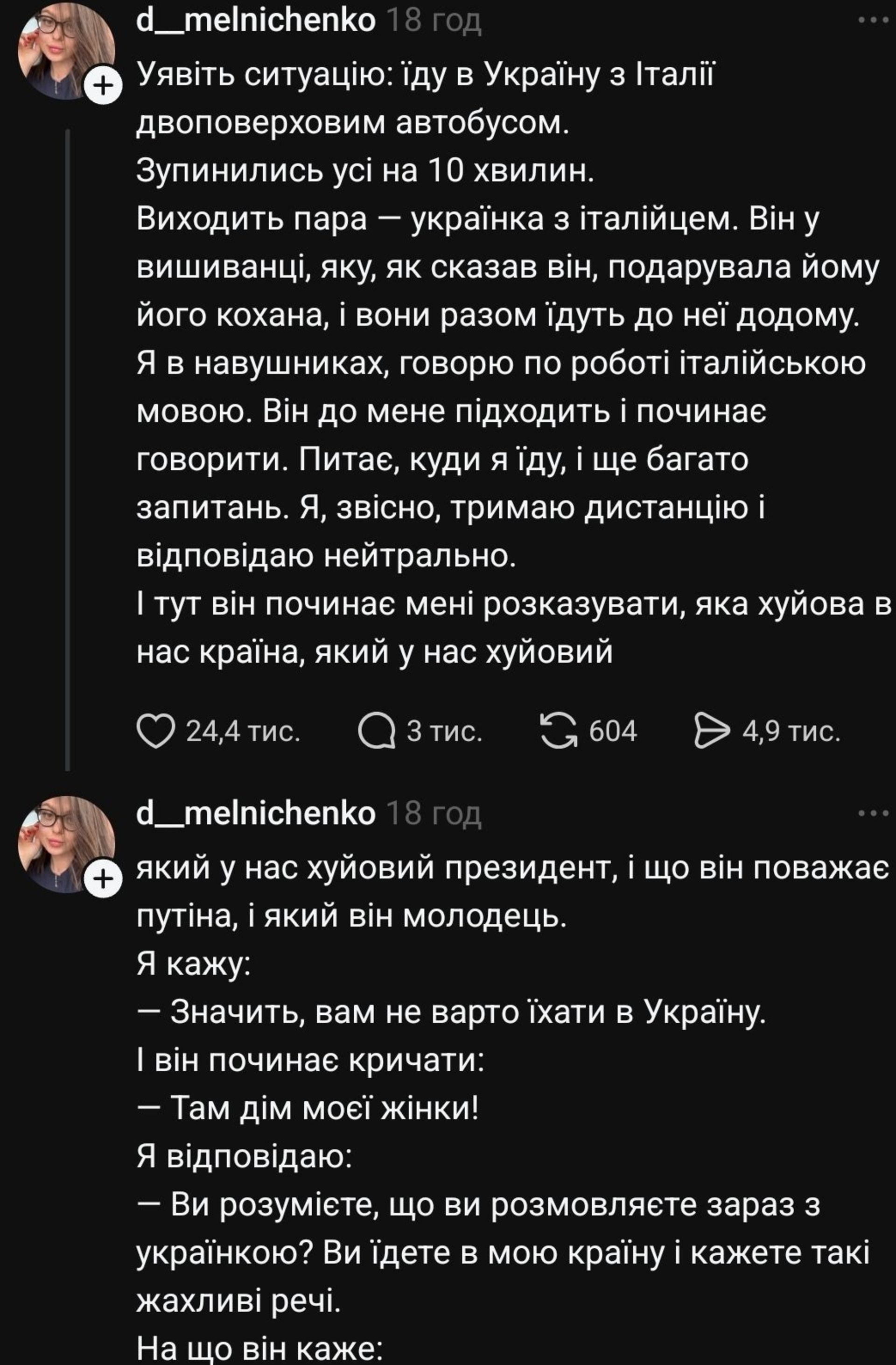 За словами Дар'ї, під час 10-хвилинної зупинки з автобуса вийшла пара — українка з італійцем. Іноземець при цьому був у вишиванці, яку, за його словами, йому подарувала кохана, до дому якої вони їдуть разом. Авторка допису говорила по роботі італійською мовою, тому чоловік підійшов до неї з наміром поговорити.