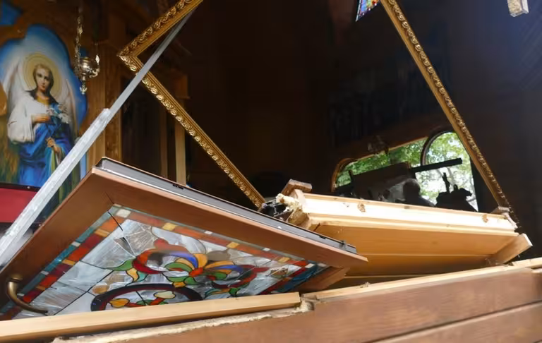 У храмі вибиті вікна та двері. Ікони та інші речі, що були в приміщенні, – розбиті та розкидані по підлозі. Комунальники та служителі церкви прибирають скло та сміття.