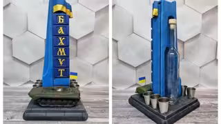 Судячи з асортименту, штоф зі стелою Бахмута продається у кількох варіаціях з різною українською технікою — «Град», МТ-ЛБ, «Акація», «Гвоздика», Т-64БВ та М113.