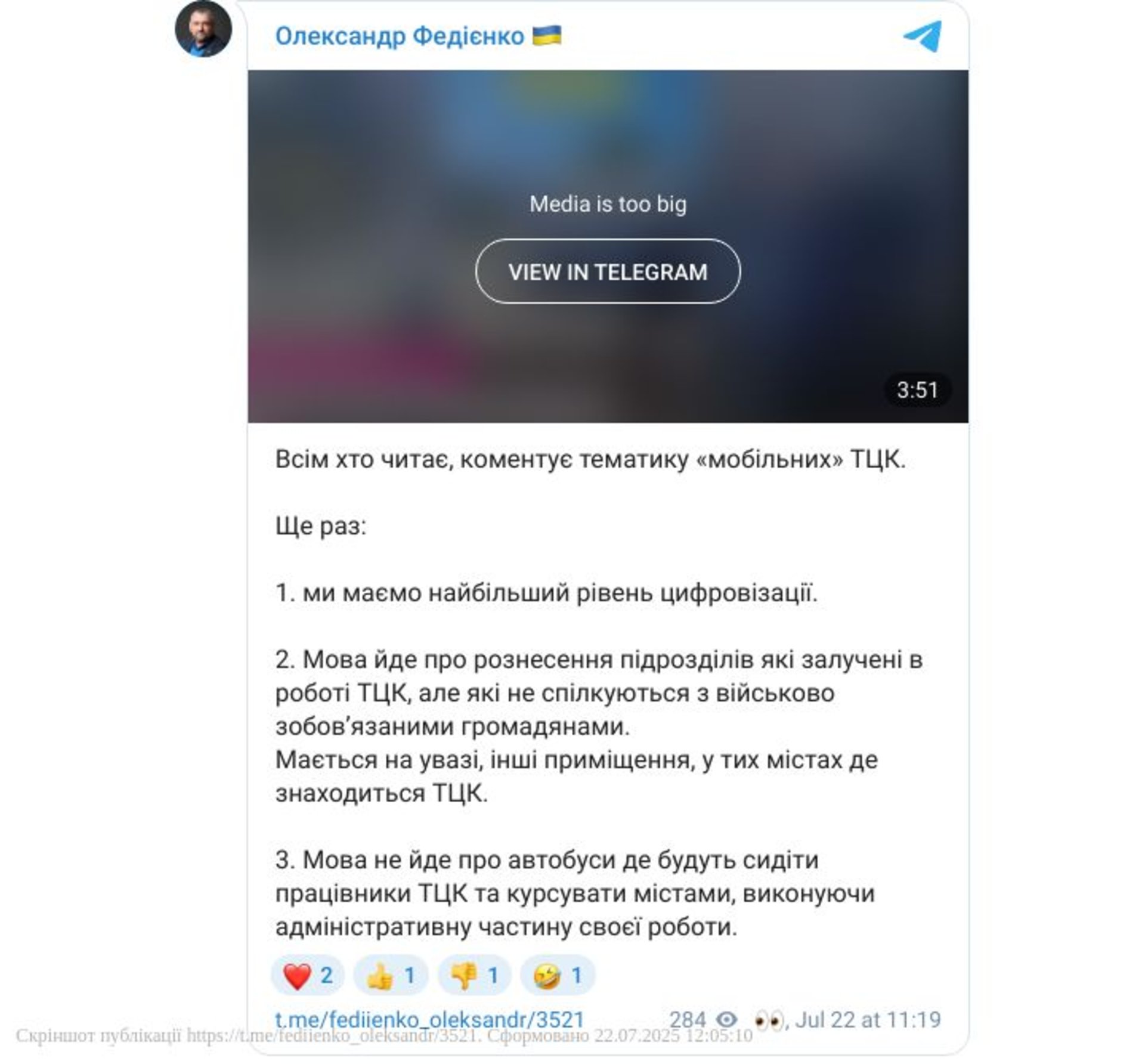 Федієнко додав, що мобільний формат роботи ТЦК уже працює, але про це поки що не пишуть у соцмережах. Кожен керівник військкомату з урахуванням загроз ударів по будівлях сам визначає, де розмістити ті чи інші підрозділи.