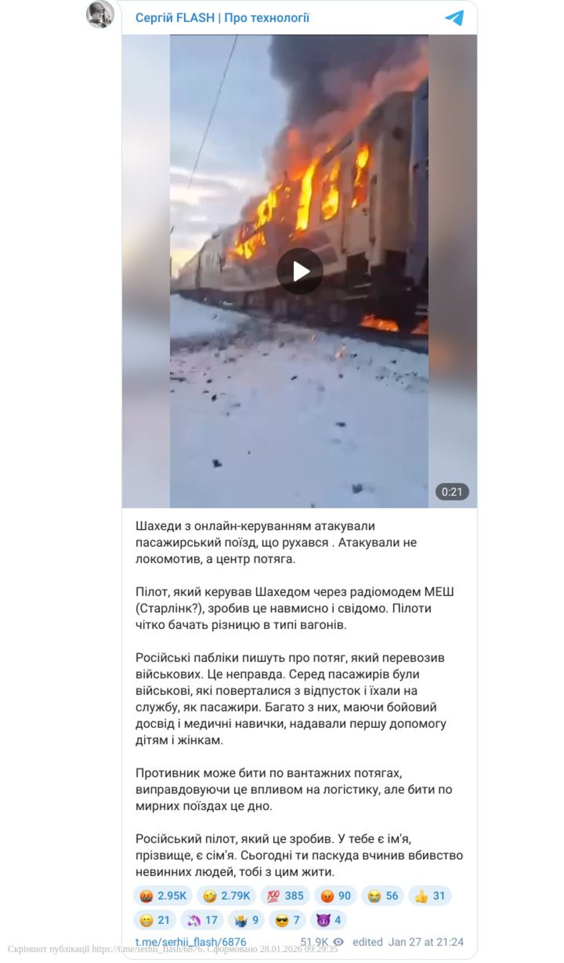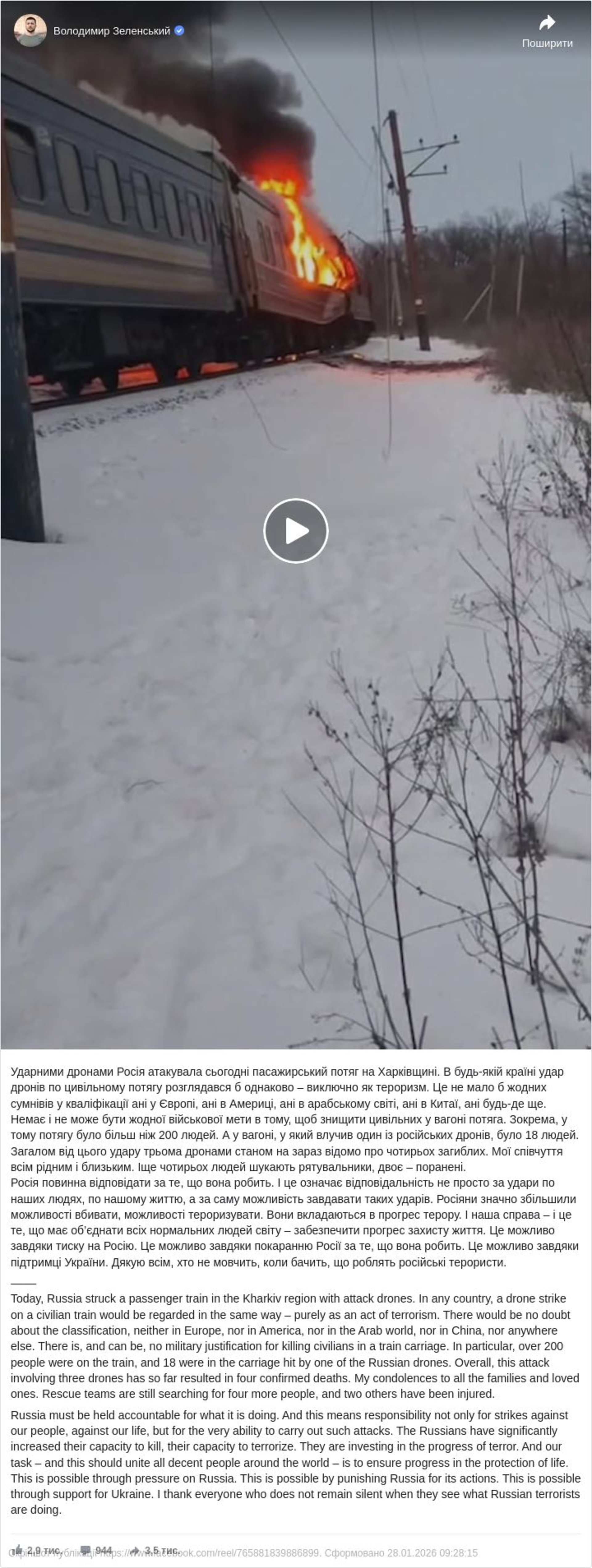 «Укрзалізниця приспустила стяги над усіма вокзалами країни на знак пам’яті про пасажирів, чиє життя забрав ворог, атакувавши 27 січня пасажирський поїзд БПЛА. Сьогоднішня хвилина мовчання — в пам’ять і про наших воїнів, і про жахливу трагедію вчора — вбитих росією наших пасажирів. Протягом усього дня флагманські поїзди, які за традицією відправляються під музику, вирушатимуть у рейси в тиші. Продовжуємо рух із пам’яттю та болем в серці», зазначається у повідомленні.
