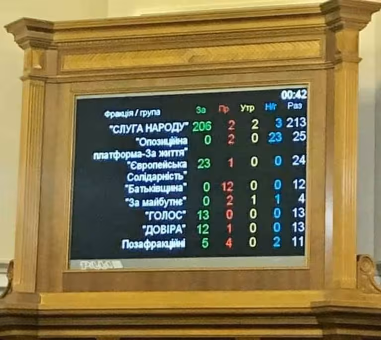 «Слуги народу» віддали 206 голосів (проти депутати Яцик і Воронько), ОПЗЖ не дали жодного голосу «за», як і «Батьківщина». «Європейська солідарність» — 23 «за», позафракційні — 5, «Голос» — 13, «Довіра» — 12, «За майбутнє» — 0.