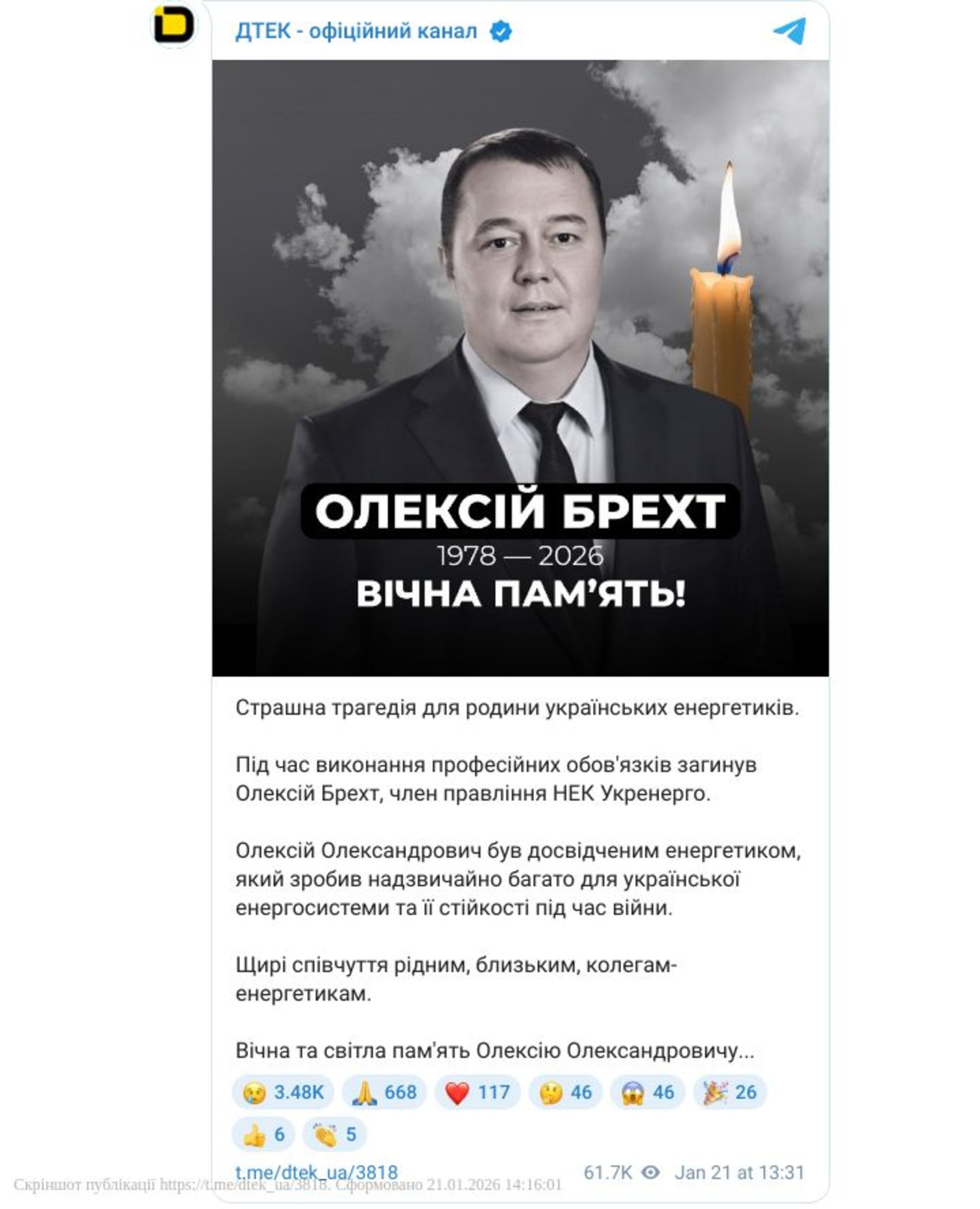 Загинув колишній керівник "Укренерго" Олексій Брехт.