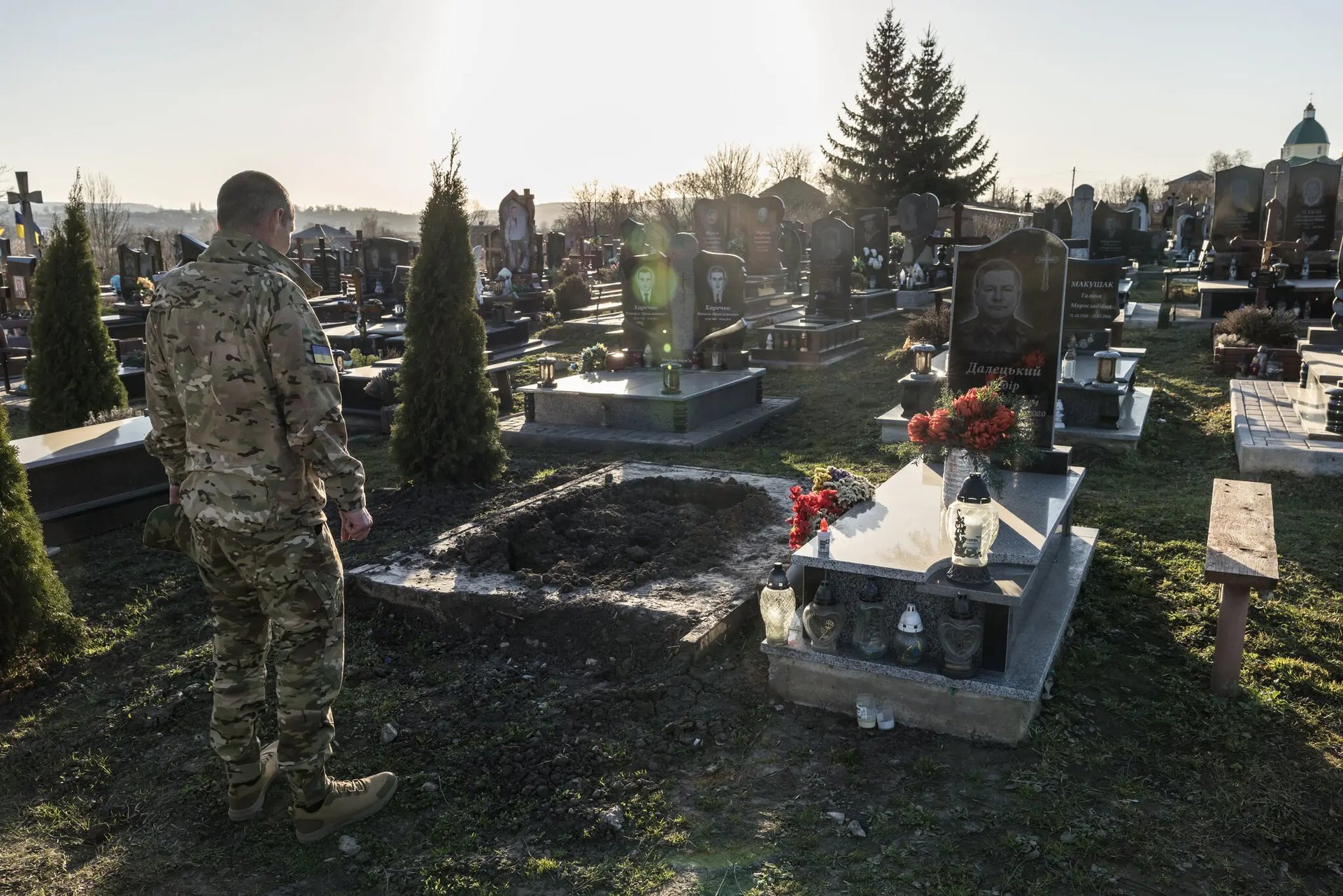 У неділю 46-річний Назарій Далецький стояв над його ж могилою, однією з кількох десятків у відкритому полі. Шість прапорів прикрашали камені на честь солдатів, загиблих на війні. Сьомий прапор, що позначав його власну могилу, було знято, як і останки поки що невідомого солдата всередині. Після розкопок залишилися купи землі.