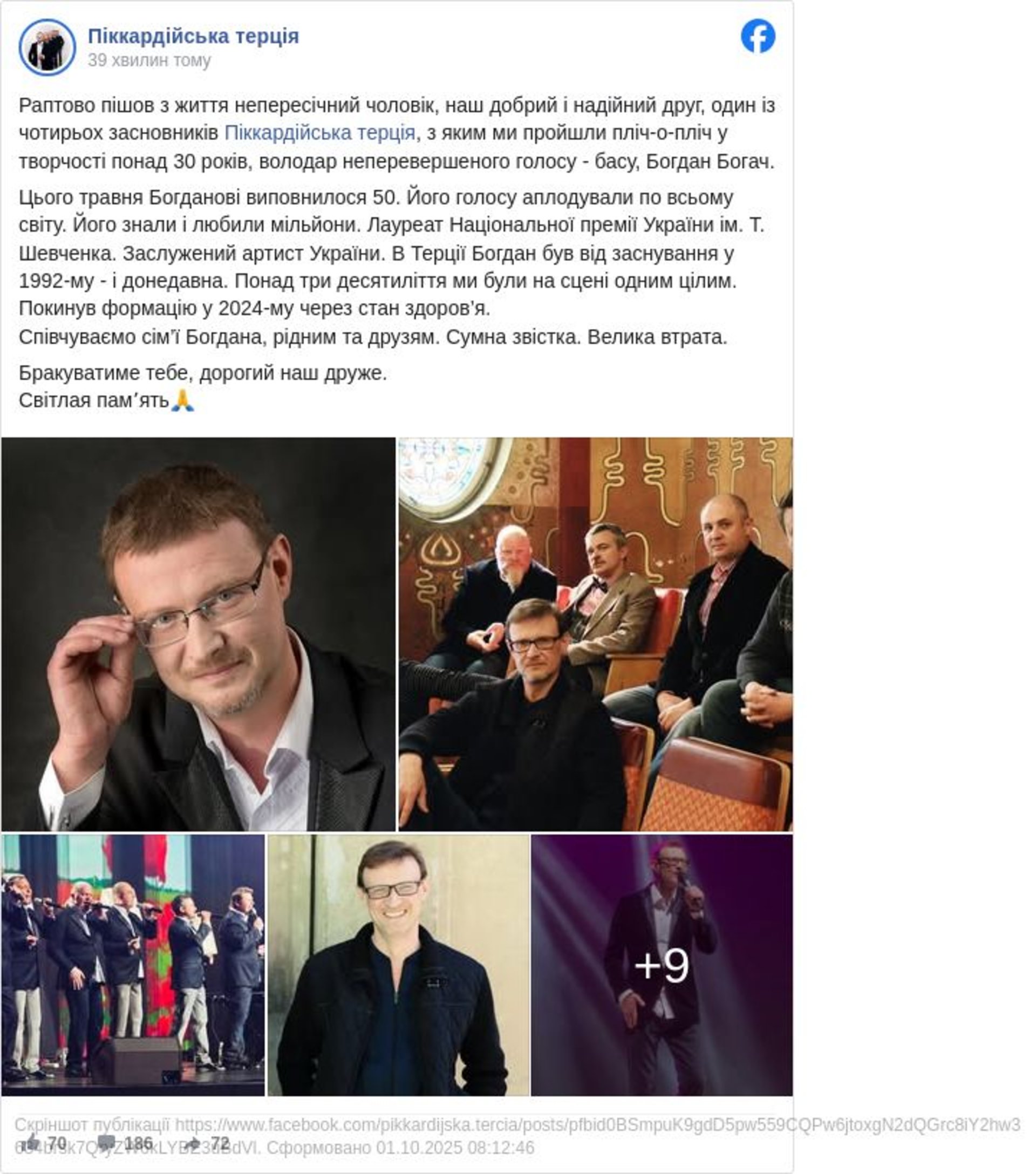 Раптово пішов з життя непересічний чоловік, наш добрий і надійний друг, один із чотирьох засновників Піккардійська терція, з яким ми пройшли пліч-о-пліч у творчості понад 30 років, володар неперевершеного голосу - басу, Богдан Богач, повідомляється на сторінці Пікардійська терція у ФБ.