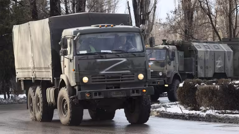 У колоні — реактивна система залпового вогню «Град», вантажівки «КамАЗ» і «Урал», а також МТ-ЛБ — плавучий бронетранспортер.