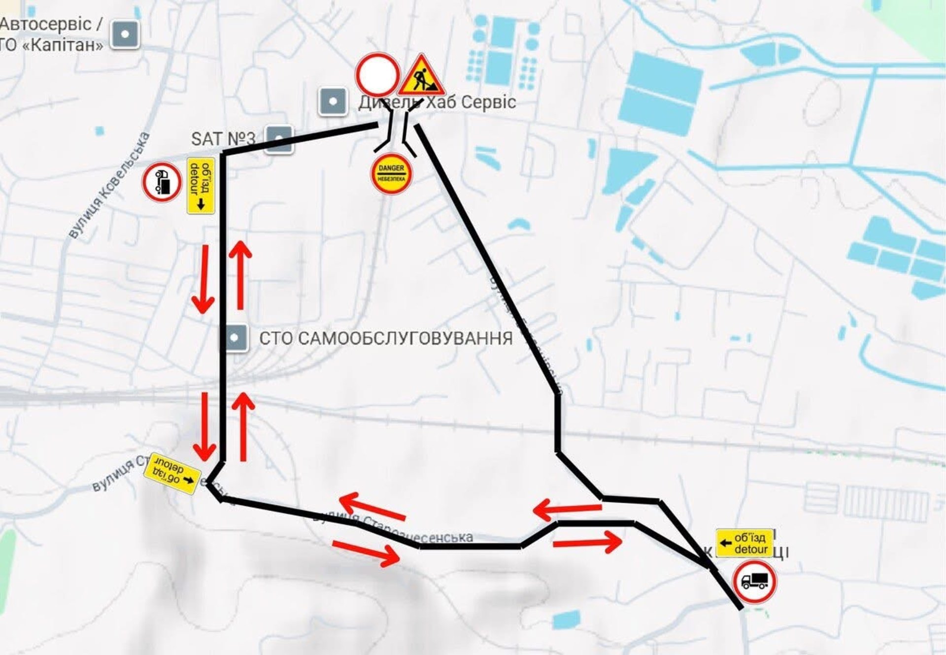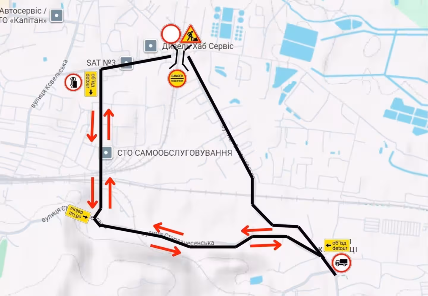 - Легковий транспорт може об'їжджати через вулиці Польова – Старознесенська – Богданівська (в обох напрямках).