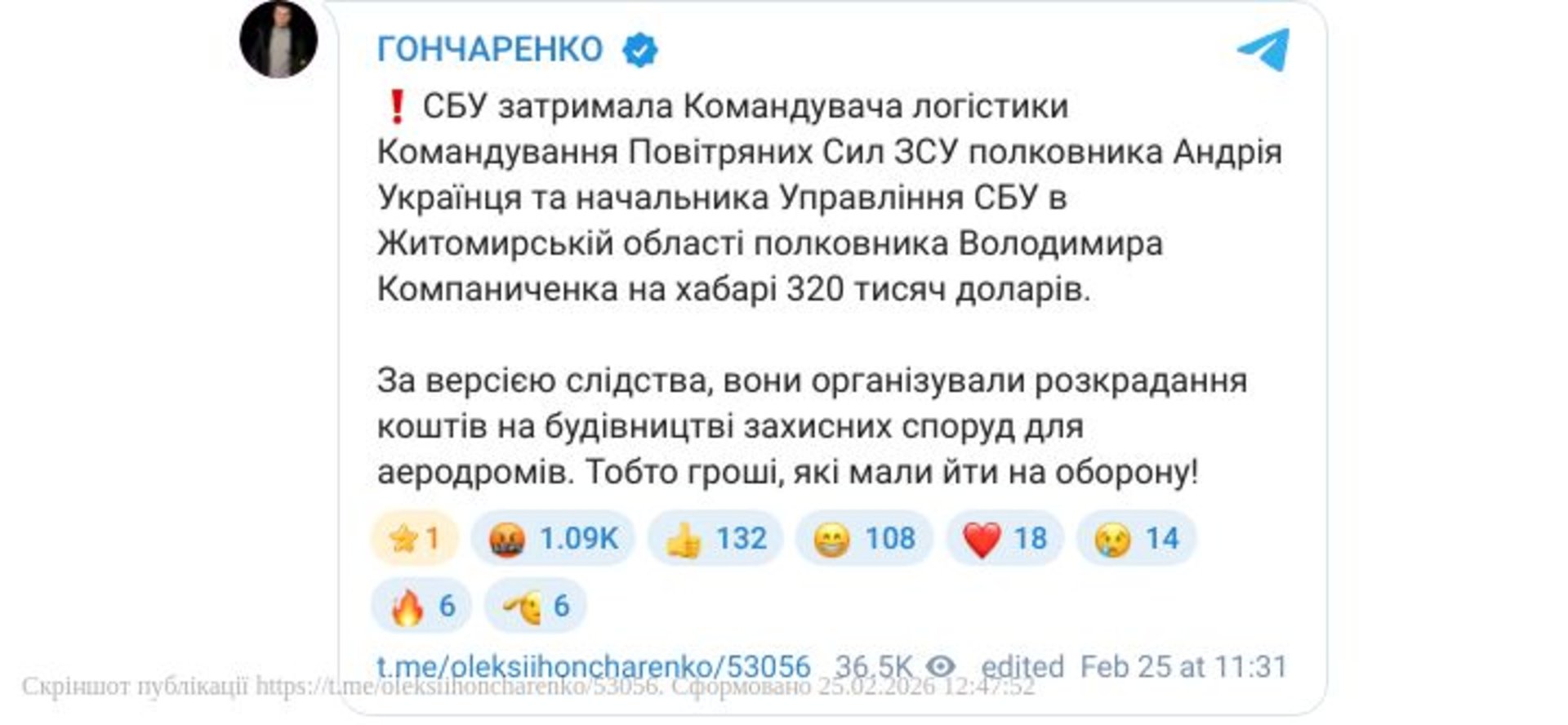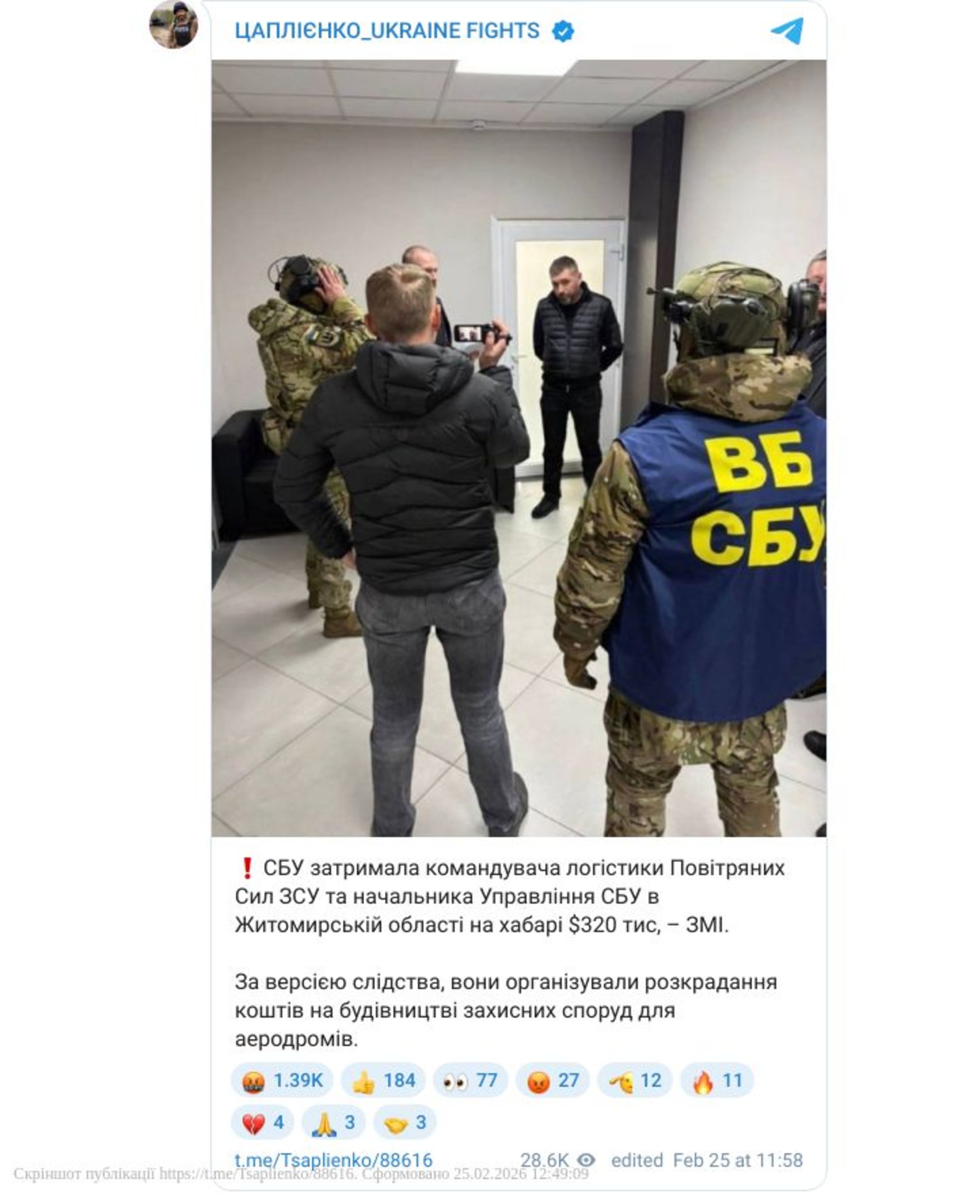 Сьогодні, 25 лютого, нардеп Олексій Гончаренко повідомив про затримання командувача силами логістики Повітряних сил ЗСУ за підозрою в отриманні хабаря. Окрім того, під слідством нібито перебуває начальник управління СБУ у Житомирській області.