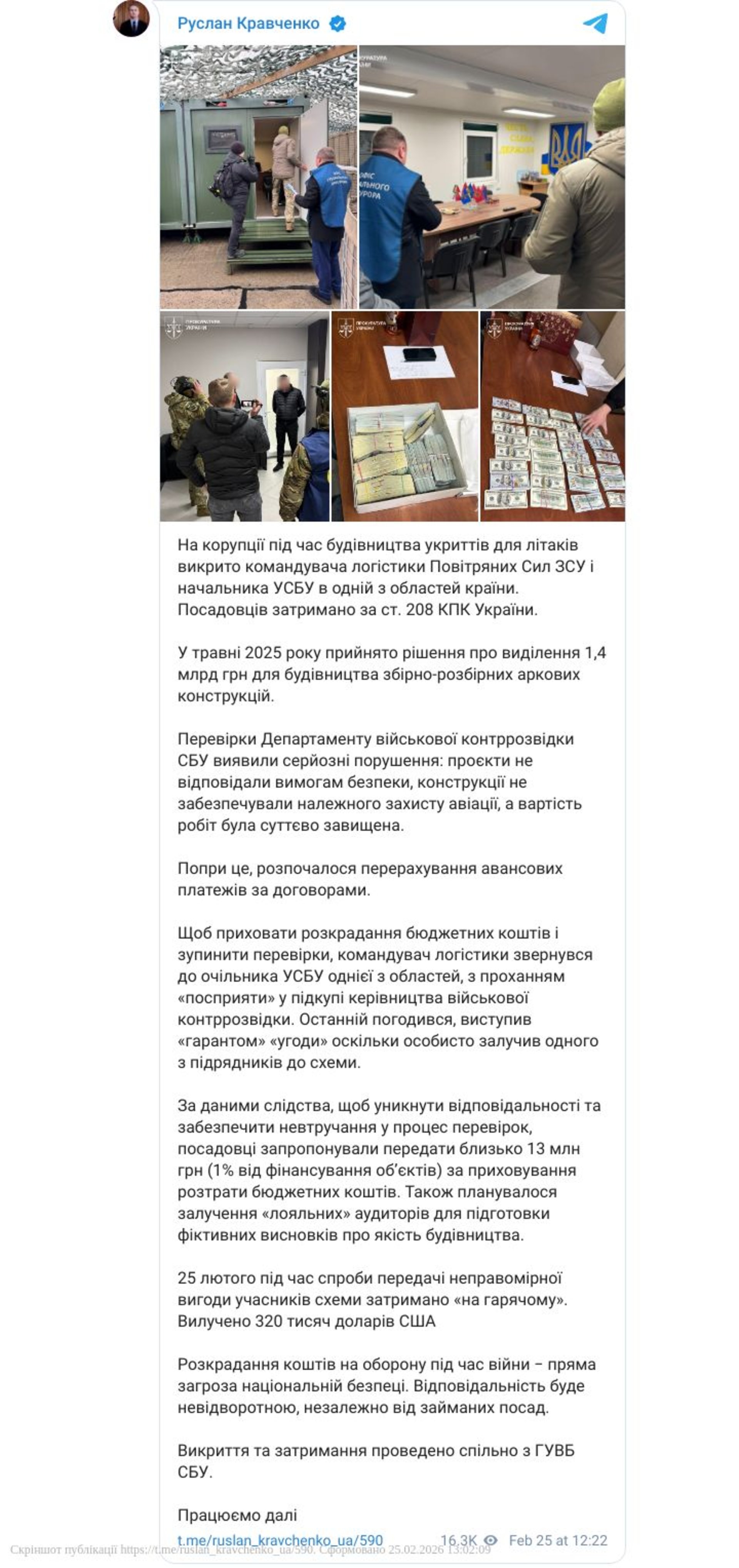 25 лютого під час спроби передачі неправомірної вигоди учасників схеми затримано «на гарячому». Вилучено 320 тисяч доларів США, зазначив Генеральний прокурор України.